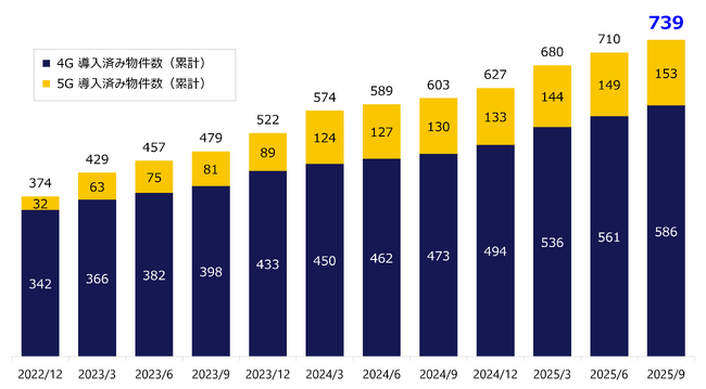 2025年9月時点の累計導入済物件数(4G/5G、国内)は739件(前年同期比123%)となりました。