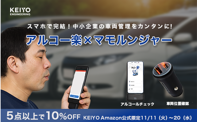 煩雑な管理の手間を減らす、スマホで完結する管理ツール。「あるこー楽」と「マモルンジャー」で、飲酒チェックと車両管理を手軽に導入できる。KEIYO Amazon公式ショップで5個以上購入で10%OFF!
