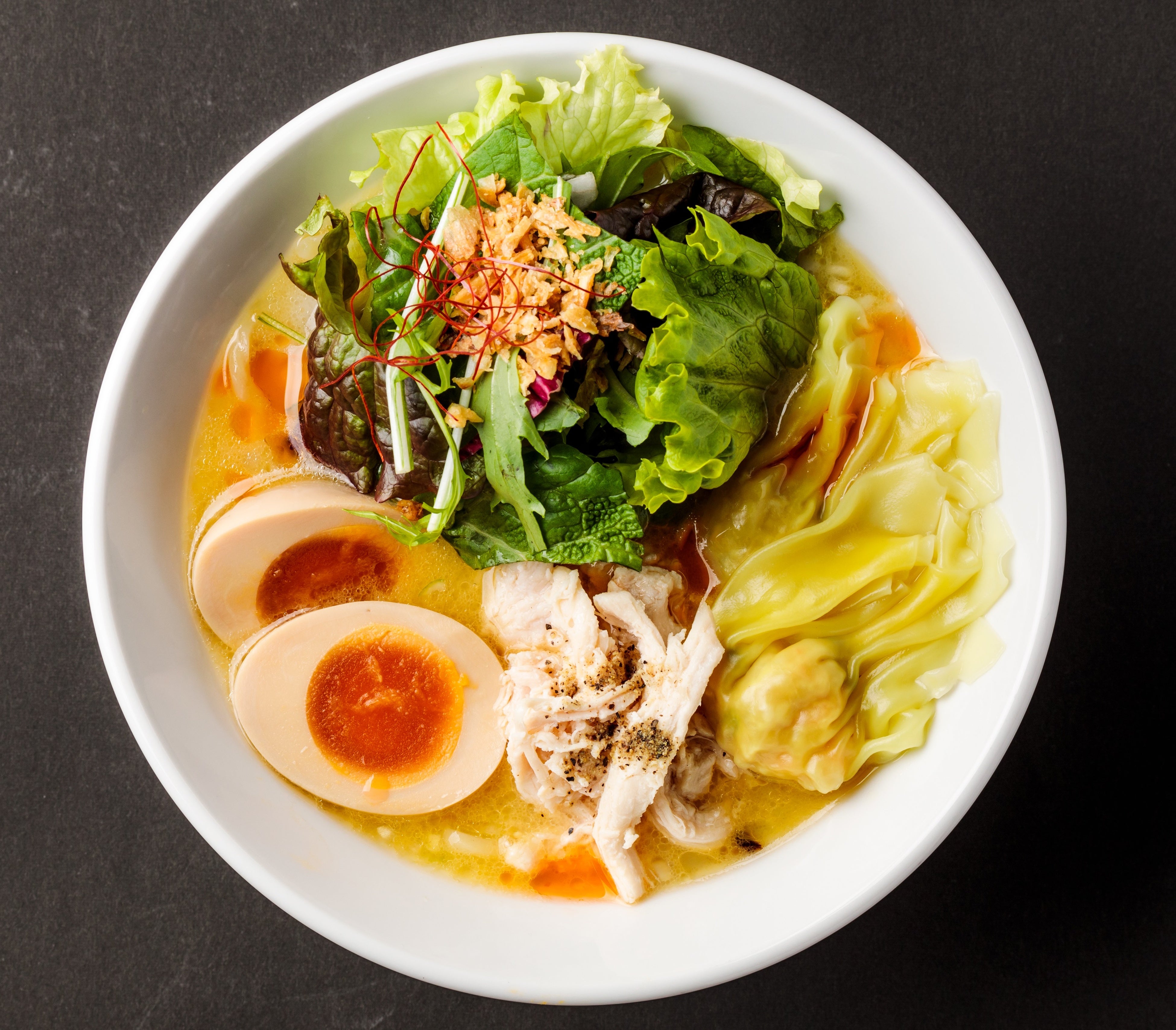 じっくりと手間ひまかけて煮込んだクリーミーで濃厚な旨みの鶏白湯スープと、もちもちとした食感のちぢれ中太麺が特徴の「鶏白湯塩そば」は、<蔭山樓>の名物メニューです。特製海老ワンタンをトッピングした、贅沢な一杯をお楽しみいただけます。
