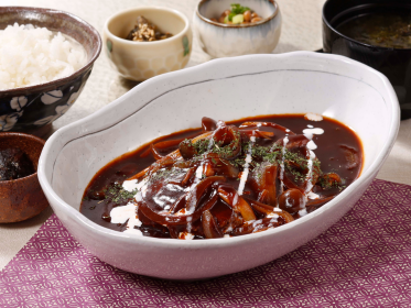 黒毛和牛を使用した贅沢なハンバーグは、こんがりと香ばしく焼き上げた、ジューシーな味わいが魅力です。濃厚でコク深い<越玄一斗>オリジナルのデミグラスソースをたっぷりと絡めて、妙高山麓こしひかりの炊きたてごはんと一緒にお楽しみいただけます。