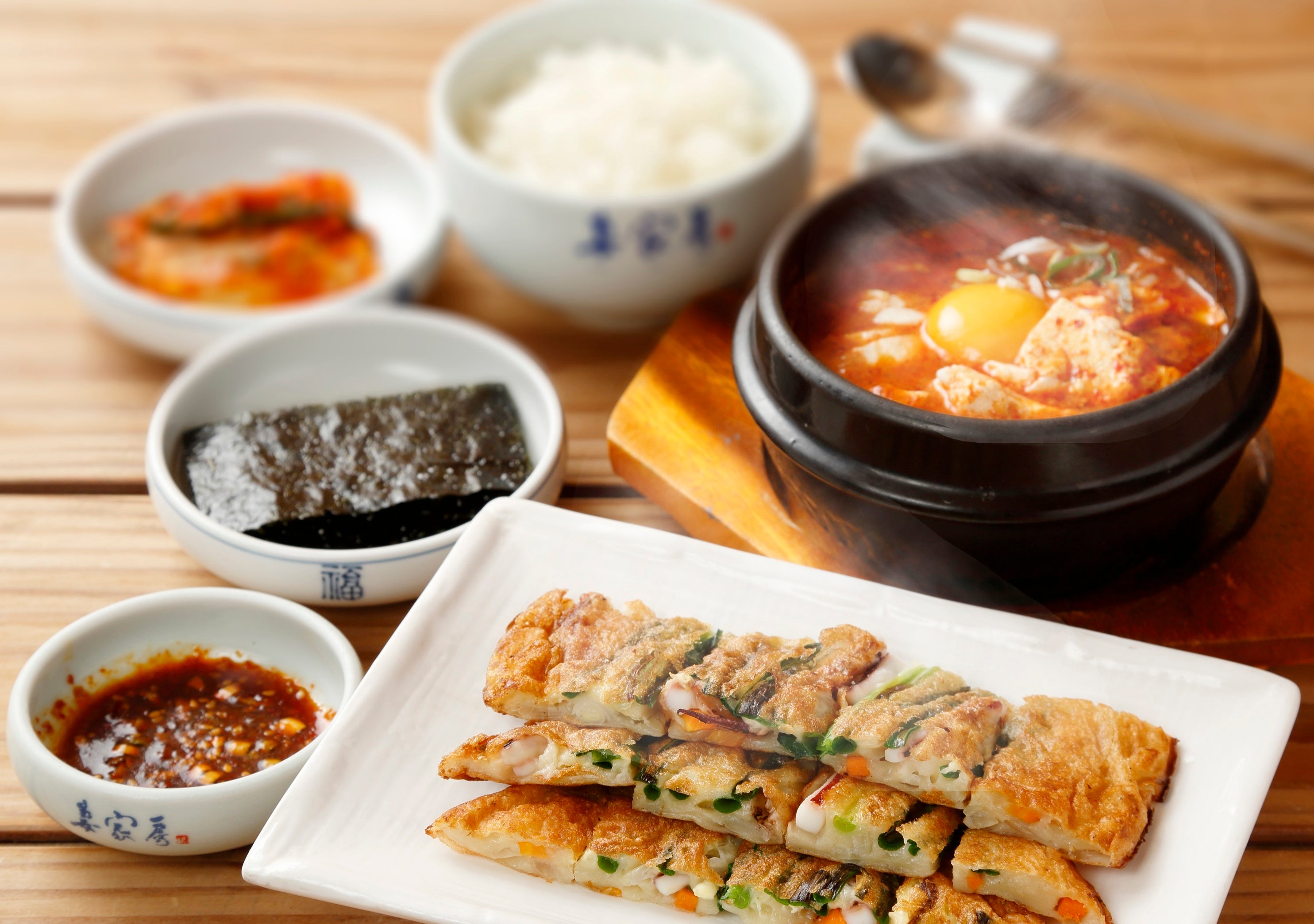 <妻家房>スンドゥブチゲ・パチヂミ(小)セット(白菜キムチ・ライス・韓国海苔付) 1人前 1,760円