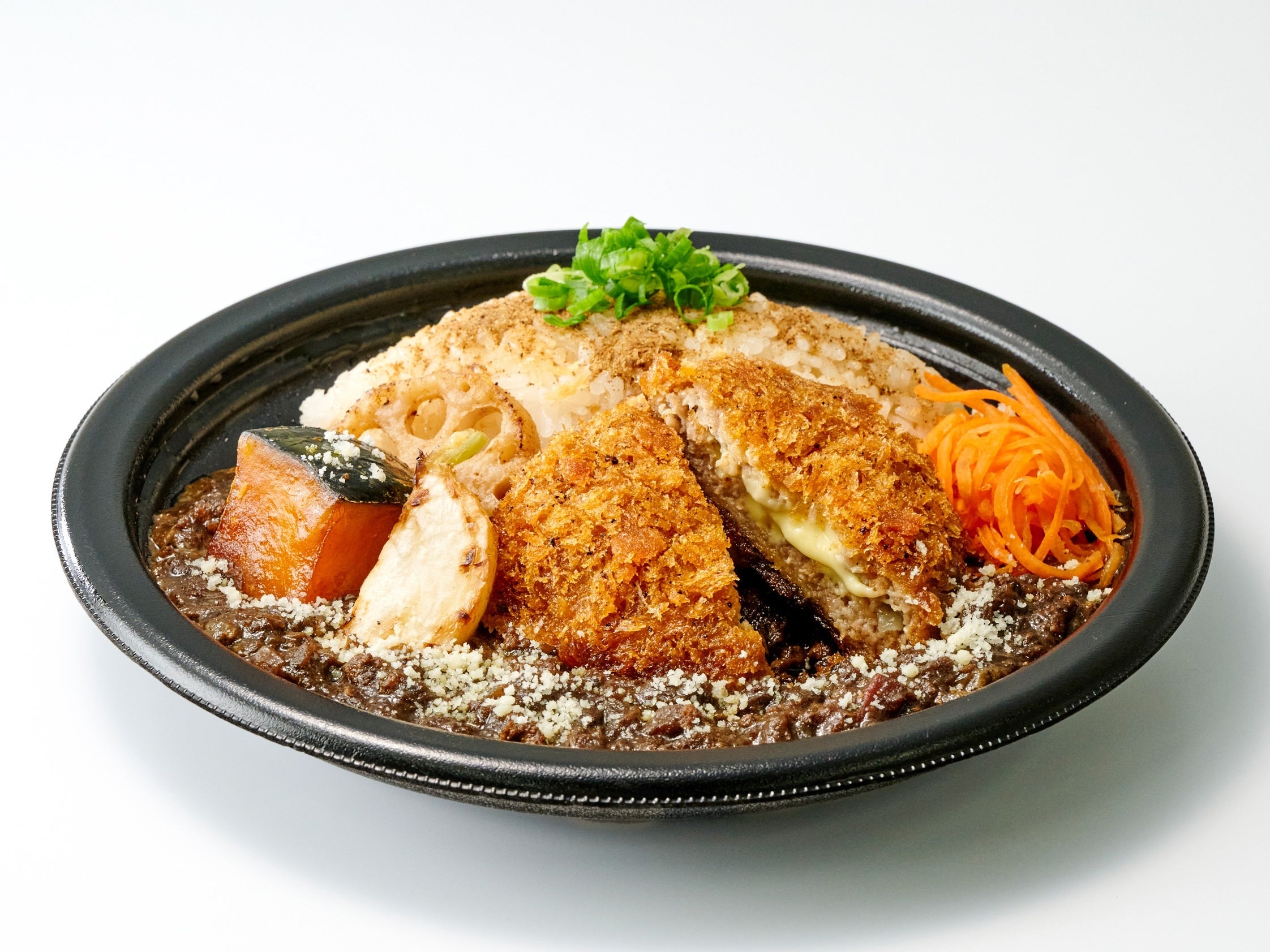 ブレンドした5種類のチーズをたっぷり詰め込んだジューシーなチーズメンチカツを添えた、ごぼうのアクセントがたまらないオリジナルカレーをあわせた逸品です。レンジで熱々に温めてお召し上がりください。