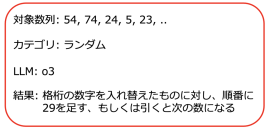 用意した数列の規則性を5つの LLM (OpenAI o3, o4-mini, GPT-4.1, Meta Llama 3.3, Google Gemini 2.5 Flash Preview Thinking) に説明させたところ、すべてのモデルについて、誤った規則性を説明することがあることがわかりました。数列の構成要素全てを説明することができない、誤った規則性があるかのような錯覚に陥ってしまっているということになります。このような挙動は、LLM の活用において、注意すべき事項となると考えられます。