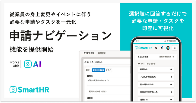 株式会社SmartHR(本社:東京都港区、代表取締役CEO:芹澤 雅人)が運営するクラウド人事労務ソフト「SmartHR(スマートエイチアール)」は、身上変更やイベントの手続きを効率化する「申請ナビゲーション」機能を11月11日より提供開始します。