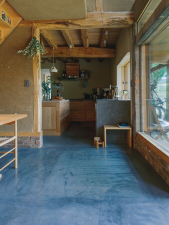 床材:1階の床はすべてモルタルに墨を混ぜて土間敷き。キッチン部分とバスルームは水に強いモールテックスで仕上げている。