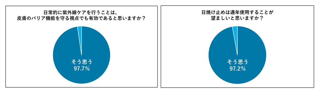◆皮膚科医師に実施した調査※1では、「日常的に紫外線ケアを行うことは、皮膚のバリア機能を守る視点でも有効である」97.7%、「日焼け止めは通年使用することが望ましい」97.2%と回答され、日常的な紫外線ケアが皮膚科医師に推奨されていることが分かりました。