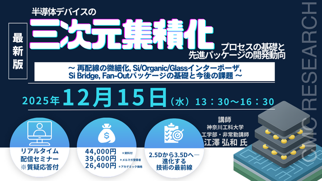 【ライブ配信/ZOOM】「半導体デバイスの三次元集積化プロセスの基礎と先進パッケージの開発動向」セミナー開催!12月15(月)主催:(株)シーエムシー・リサーチ