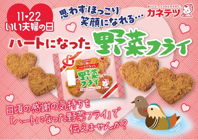 カネテツのタグライン「おいしさ、ココロとカラダに」を体現する、“ありがとう”の気持ちをかたちにしたハート型の「野菜フライ」。1955年の発売以来、皆さまに愛され続けてきたロングセラー「野菜フライ」の味と食感はそのままに、感謝と愛情を込めたミニサイズのハート型で、4個入りの特別仕様に仕上げました。