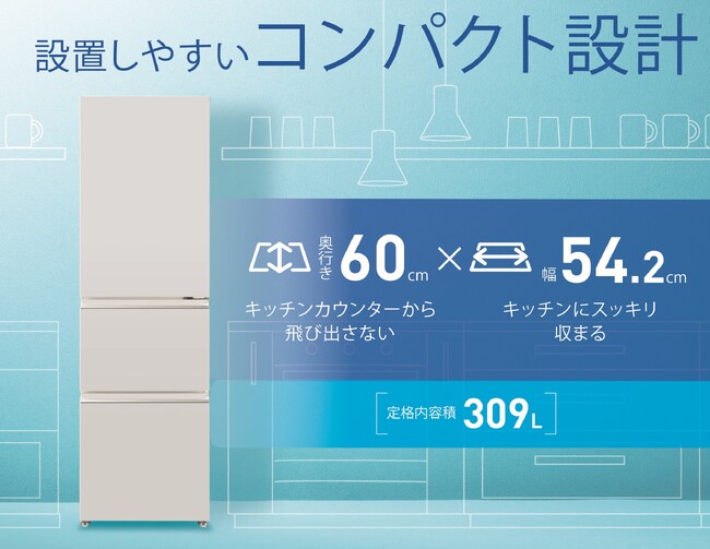 都市部の住空間やキッチンの省スペース化が進む中、冷蔵庫には「設置しやすさ」と「収納力」の両立が求められています。AQUAは、こうした生活者の声を反映し、コンパクトながら大容量・省エネを実現した新モデルを開発しました。