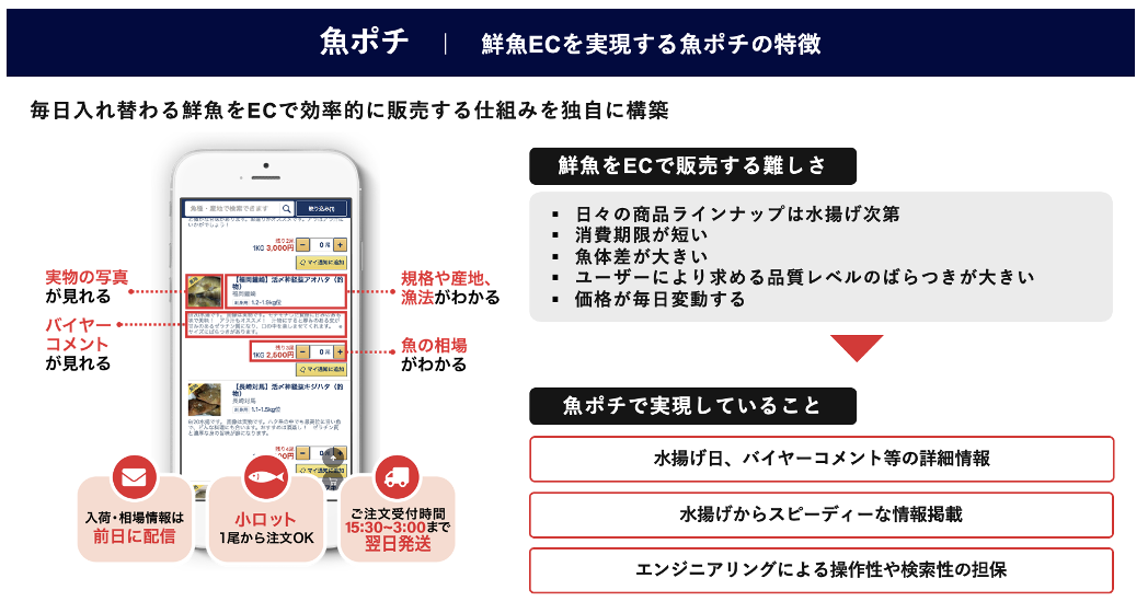 『魚ポチ』は「料理人の仕入れ時間を減らし、欲しい食材をどこにいても、すぐに手に入れられる世界」をサービスビジョンとして飲食店向けに全国の産地や中央卸売市場から仕入れた商品をインターネットを介して卸売りするサービスです。飲食店は各店コンセプトやメニューが違い、また店頭在庫に応じて日々の仕入れを管理する必要があり、その多くは自ら卸売市場に出向き在庫の補充や当日のメニューを考えていました。魚ポチではあらゆる飲食店の経営者及びスタッフがより店舗運営に集中できるように、豊富な商品をウェブサイト上で販売しており、1尾から商品を店頭まで配送しています。累計40,000店舗以上の飲食店様にご登録いただいています。