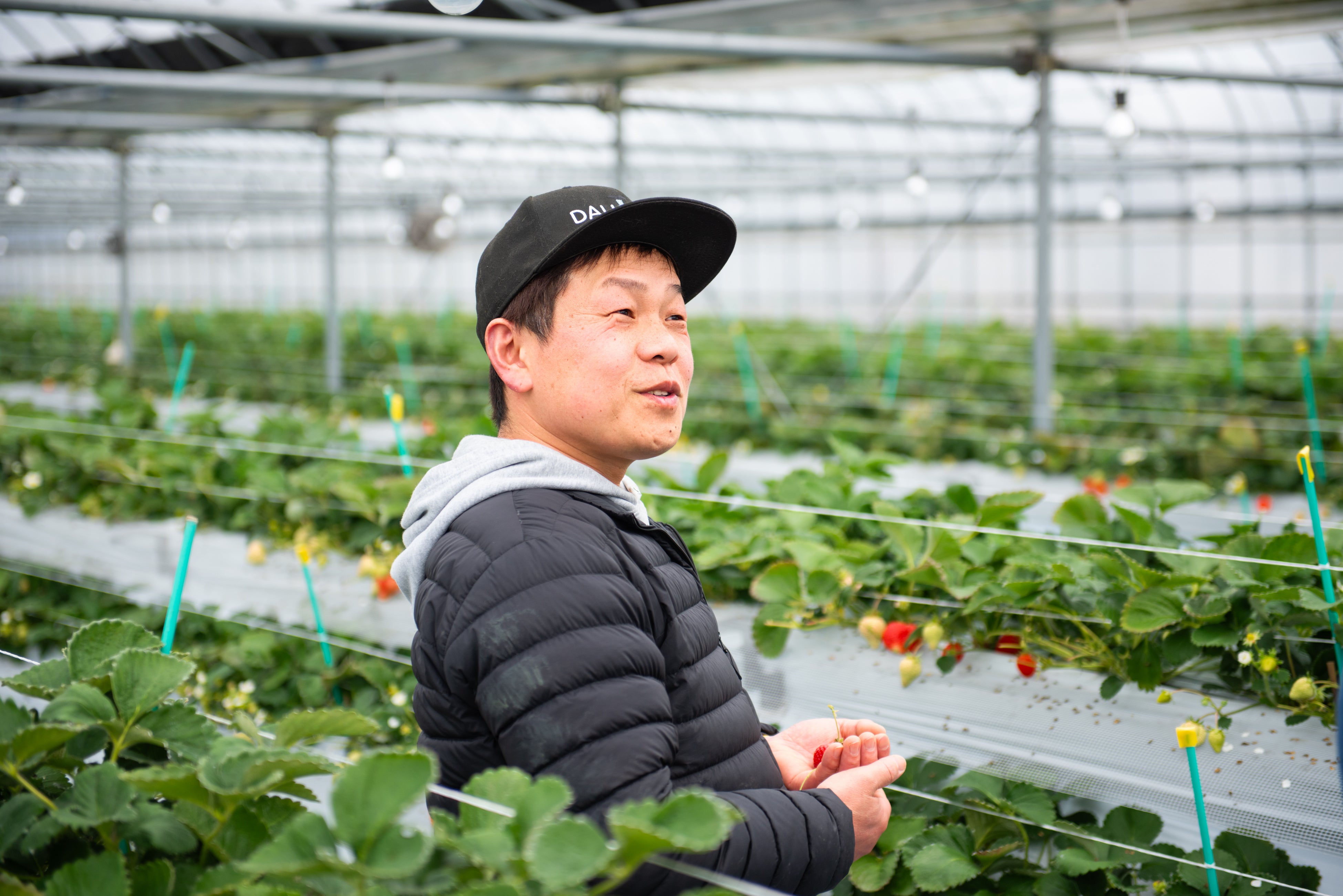 “あかい、まるい、おおきい、うまい”の頭文字から命名された、いちごの王様「あまおう」ですが、その栽培には、古い葉っぱの除去から花の間引き、そして果実に光を当てる繊細な作業など、丹念な手入れが欠かせません。