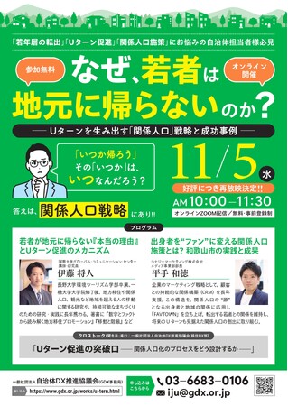 一般社団法人自治体DX推進協議会(所在地:東京都港区、以下GDX)は、多くの自治体が直面する「若年層の転出」や「Uターン促進」の課題解決の鍵となる「関係人口」戦略に焦点を当てたオンラインセミナー「なぜ、若者は地元に帰らないのか? ~Uターンを生み出す『関係人口』戦略と成功事例~」を、多数のご要望にお応えし、本日よりアーカイブ配信の申し込み受付を開始いたします。