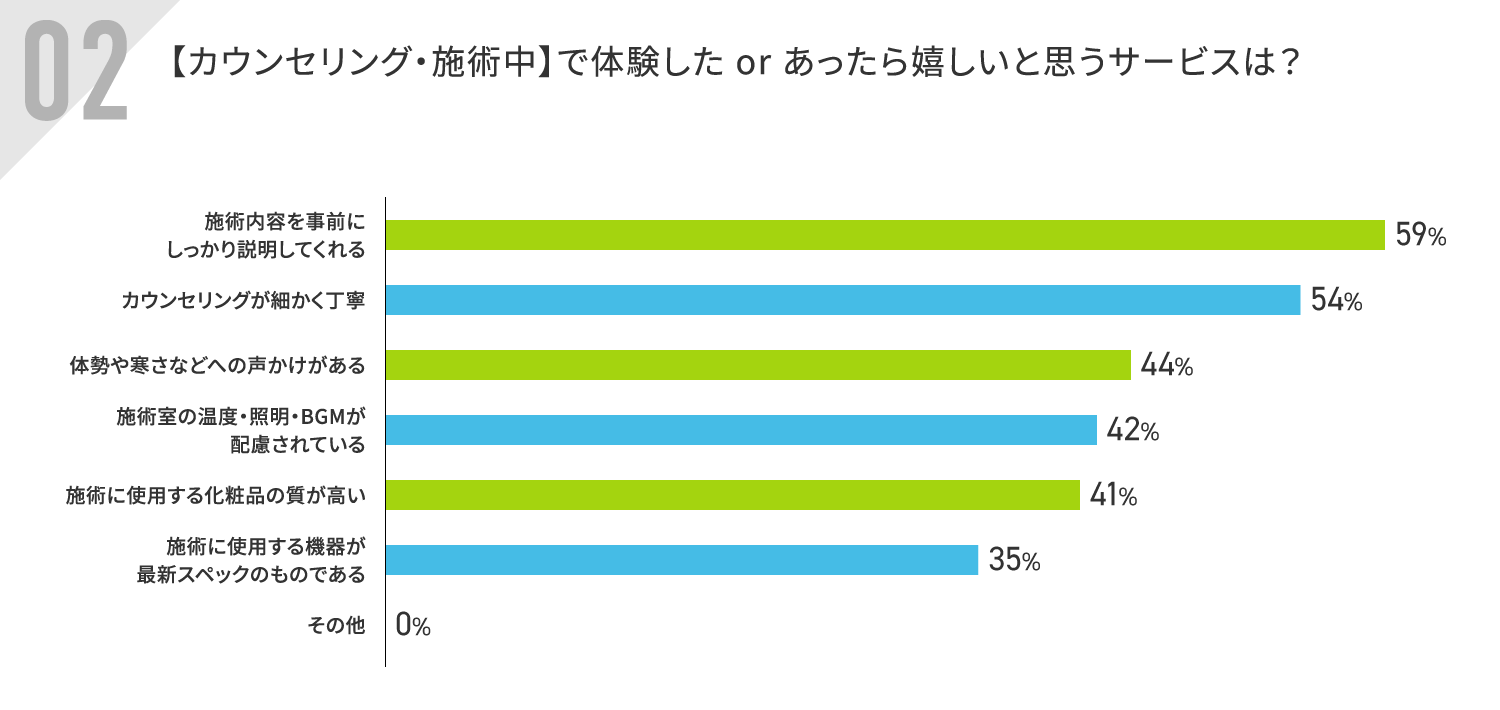 【カウンセリング・施術中】で体験した、またはあったら嬉しいサービスは「施術内容を事前にしっかり説明してくれる」が59%で最多となりました。次いで「カウンセリングが細かく丁寧」が54%と続く結果となりました。