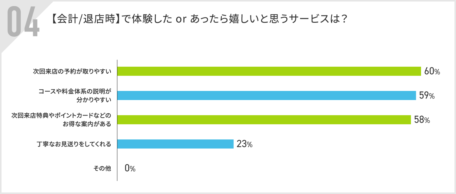 「会計・退店時」で体験した、またはあったら嬉しいサービスは「次回来店の予約が取りやすい」が60%で最多、次いで「コースや料金体系の説明が分かりやすい」が59%で続く結果となりました。