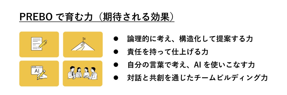 これらの作業は全て手作業となり、AIのスライド作成機能で作り上げることはできません。自らの手で完遂させなければならない、という「責任」が伴います。PREBOはこの「実感」を伴う経験を通し、生成AI時代を生き抜くビジネスパーソンとして、責任を持ち、自らの頭で考え、チームとして共創する基盤を育みます。