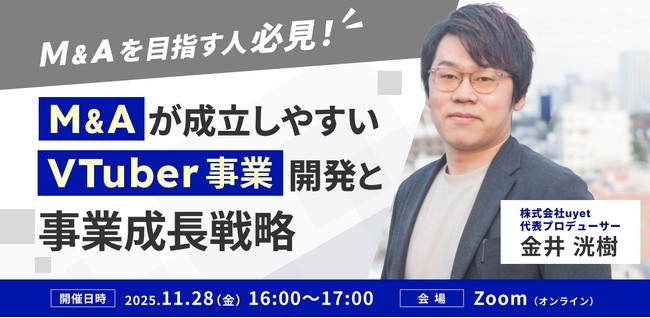 VTuber、IPコンテンツを通して日本と世界で新たな流通を生み出す“IPコンテンツの総合商社”株式会社uyet(ユエット)(本社:東京都渋谷区、代表取締役:梶田大樹)は、11月28日(金)16時より、VTuber事業を行う企業様向けのウェビナー「VTuber事業M&Aを目指す人必見!M&Aが成立しやすいVTuber事業開発と事業成長戦略」を開催します。