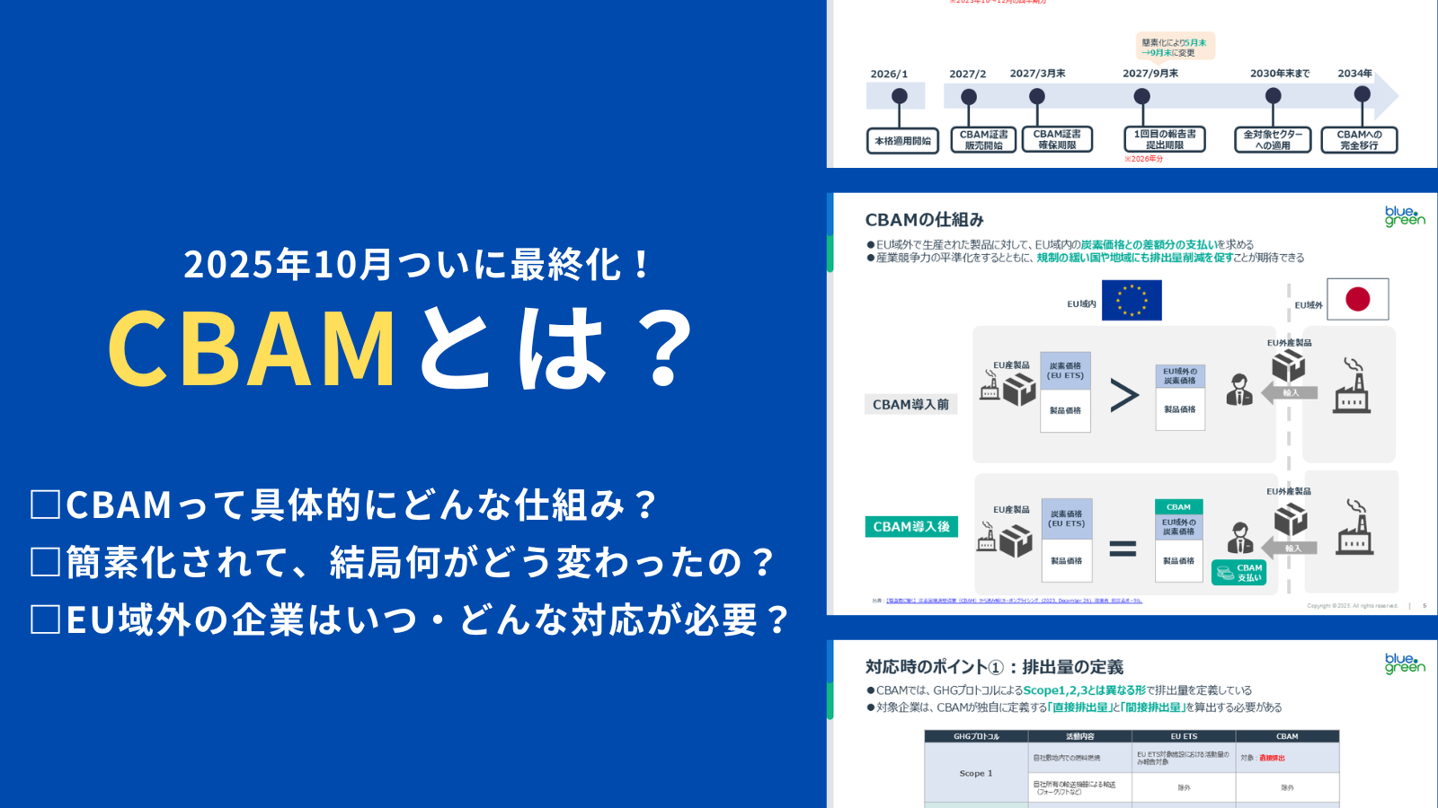 株式会社エスプールブルードットグリーン(本社:東京都千代田区、取締役社長:八林公平、以下「当社」)は、企業のサステナビリティ担当者向けに、EUのCBAM(炭素国境調整措置)制度の基本から最新動向までを分かりやすくまとめたお役立ち資料「CBAMとは?」を無料公開しました。