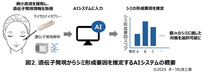 ポーラ・オルビスグループの研究・開発・生産を担うポーラ化成工業株式会社(本社:神奈川県横浜市、社長:片桐崇行)は、微小皮膚採取技術である「マイクロバイオプシー」を用いて、個々のシミ(老人性色素斑)の遺伝子発現状態から、そのシミができた形成要因を推定するAIを構築することに成功しました。