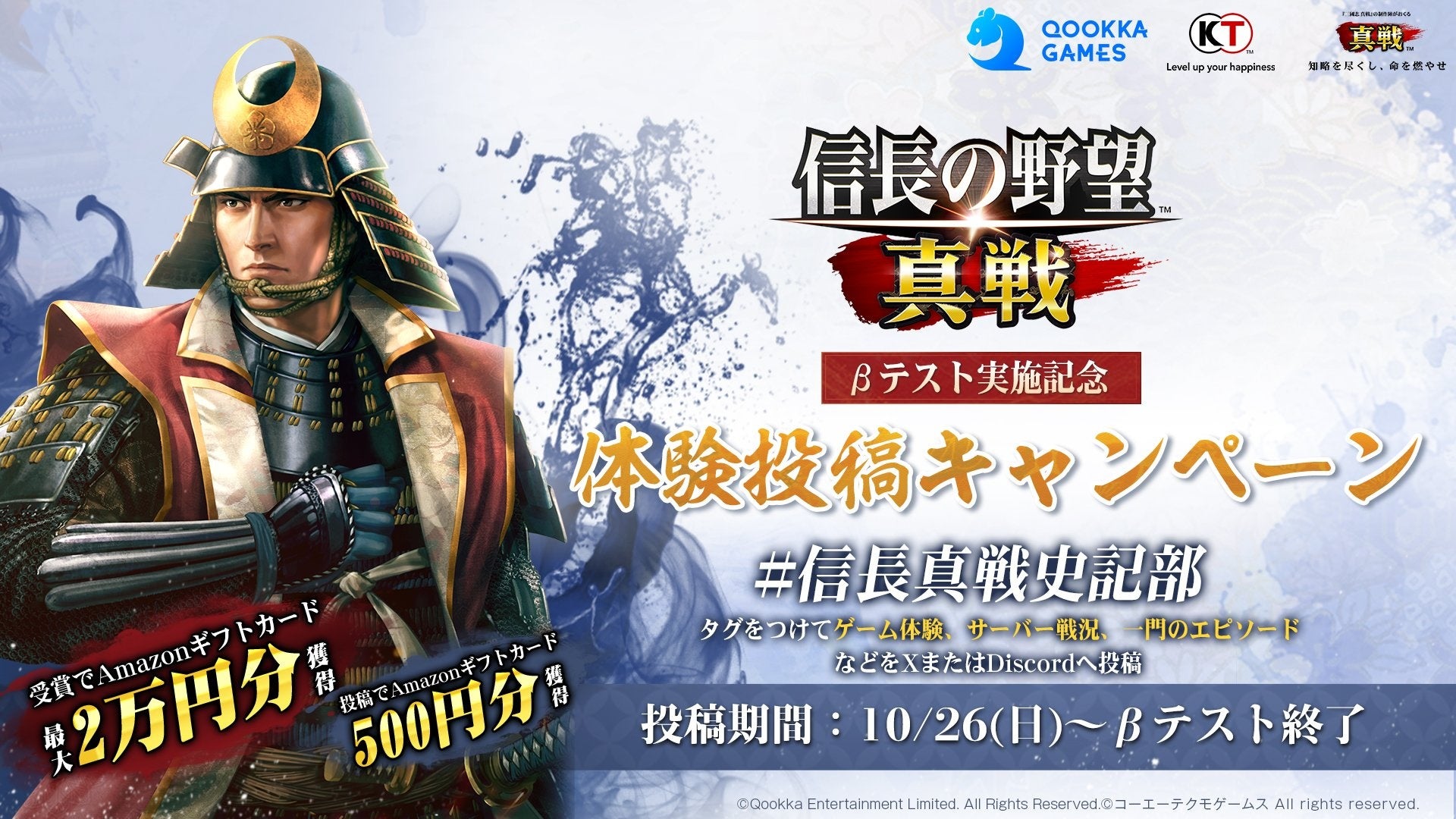 概要: 「#信長の野望真戦」と「#信長真戦史記部」のタグをつけて、ゲームプレイの記録/サーバー戦況レポート/一門のエピソードなどをXまたは公式Discordに投稿しましょう!投稿者全員(投稿要件達成者対象)に500円分のAmazonギフトカードをプレゼント!最大2万円分のAmazonギフトカードが当たるチャンス!