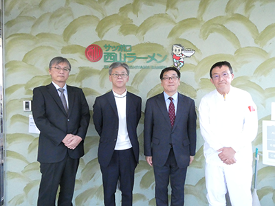 左から1番目:西山製麺 通販営業部長 川上賢訓様、左から2番目:システム・ケイ代表取締役社長 蓬田健二、右から1番目:西山製麺 専務取締役 西山博様、右から2番目:サクサ代表取締役社長 齋藤政利