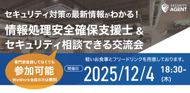 サイバーセキュリティ専門メディア「サイバーセキュリティ.com」(https://cybersecurity-jp.com/)を運営する株式会社セキュアオンライン(所在地:千葉県柏市、代表取締役:角田優剛)は、同じく運営するセキュリティ専門家と企業をマッチングするプラットフォームサービス『セキュリティエージェント』(https://securityagent.jp/)のコミュニティにて、セキュリティに関心のある皆様に向けた交流イベント「セキュリティ交流会」の第10回目を、2025年12月4日(木)に開催いたします。