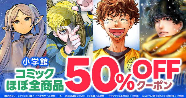 小学館コミックほぼ全商品対象50%OFFクーポンが11月14日からスタート!『チ。 ―地球の運動について―』『葬送のフリーレン』『アオアシ』など大人気作品が対象!