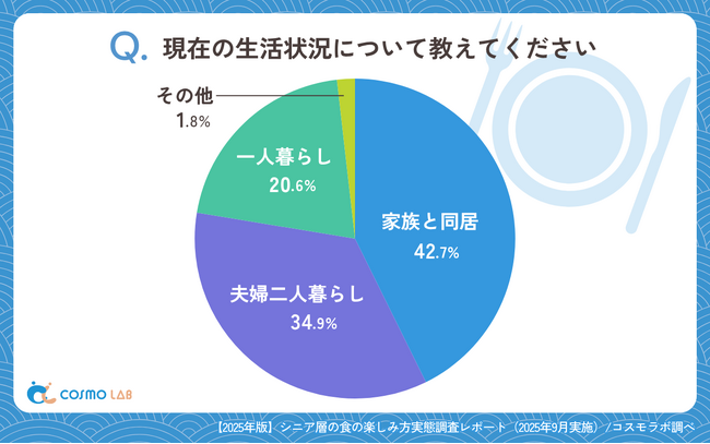 「家族と同居」(42.7%)が最多で、次いで「夫婦二人暮らし」(34.9%)が続きました。「一人暮らし」(20.6%)も2割を超えており、単身世帯の存在感が大きいことが特徴です。
