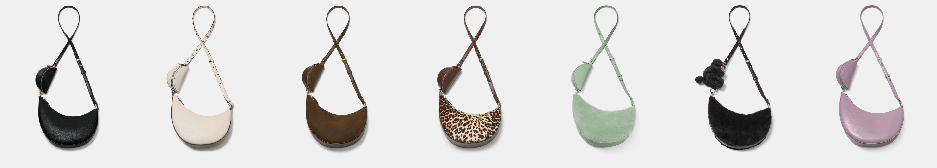 左から:ケーエスデュオ クロスボディ バッグ ブラック、カシューミルク ¥52,800、 ケーエスデュオ スエード クロスボディ バッグ バーントセージ ¥52,800、 ケーエスデュオ ダウンタウン レオパード ヘアカーフ クロスボディ バッグ レオパードマルチ ¥62,700、 ケーエスデュオ シアリング クロスボディ バッグ ミントフロスティング ¥62,700、 ケーエスデュオ シアリング ベア クロスボディ バッグ ブラックマルチ ¥71,500、 ケーエスデュオ グレーズドレザー クロスボディ バッグ マーケットパープル ¥52,800 すべて税込み価格。 サイズ:22cm × 27cm × 7cm