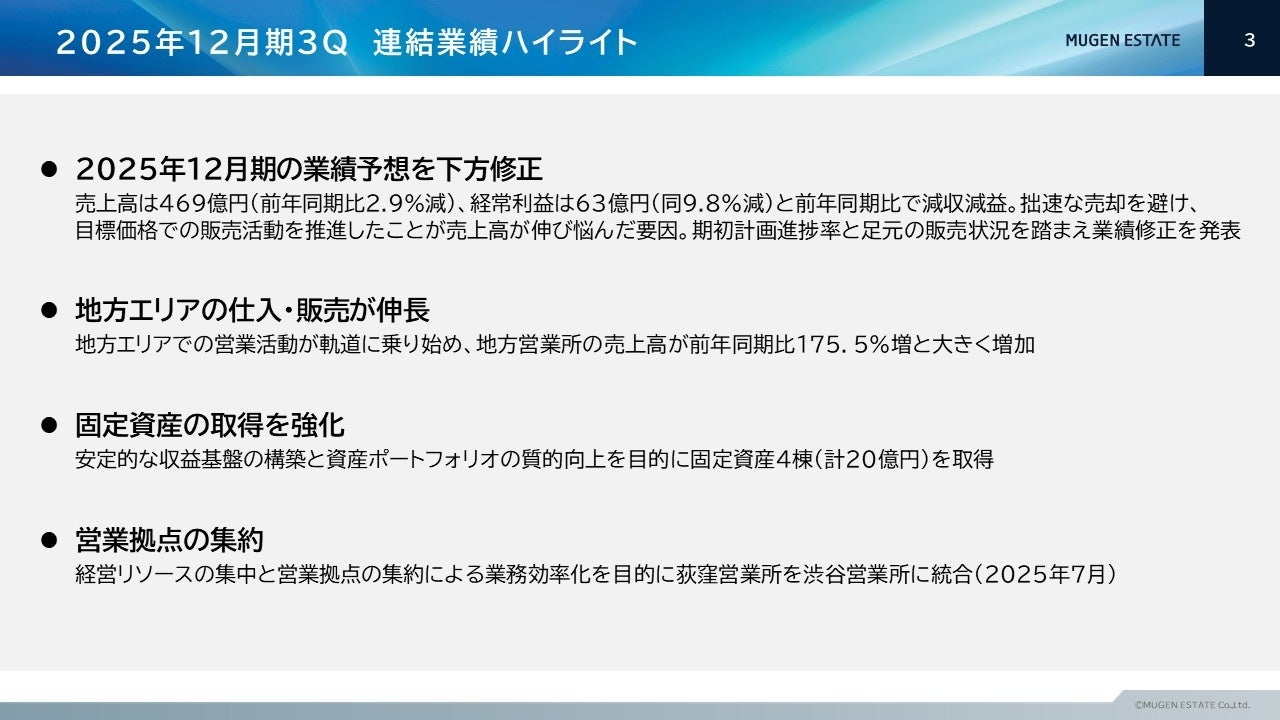 株式会社ムゲンエステート(本社:東京都千代田区、代表取締役:藤田進一)は、2025年12月期第3四半期決算を発表いたしました。
