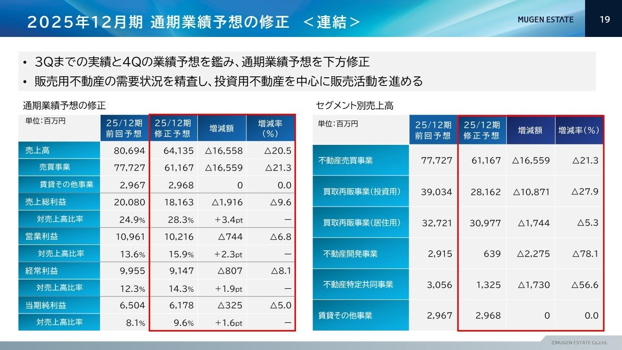第3四半期決算の数値を踏まえ、2025年12月期の通期業績予想を下方修正しました。