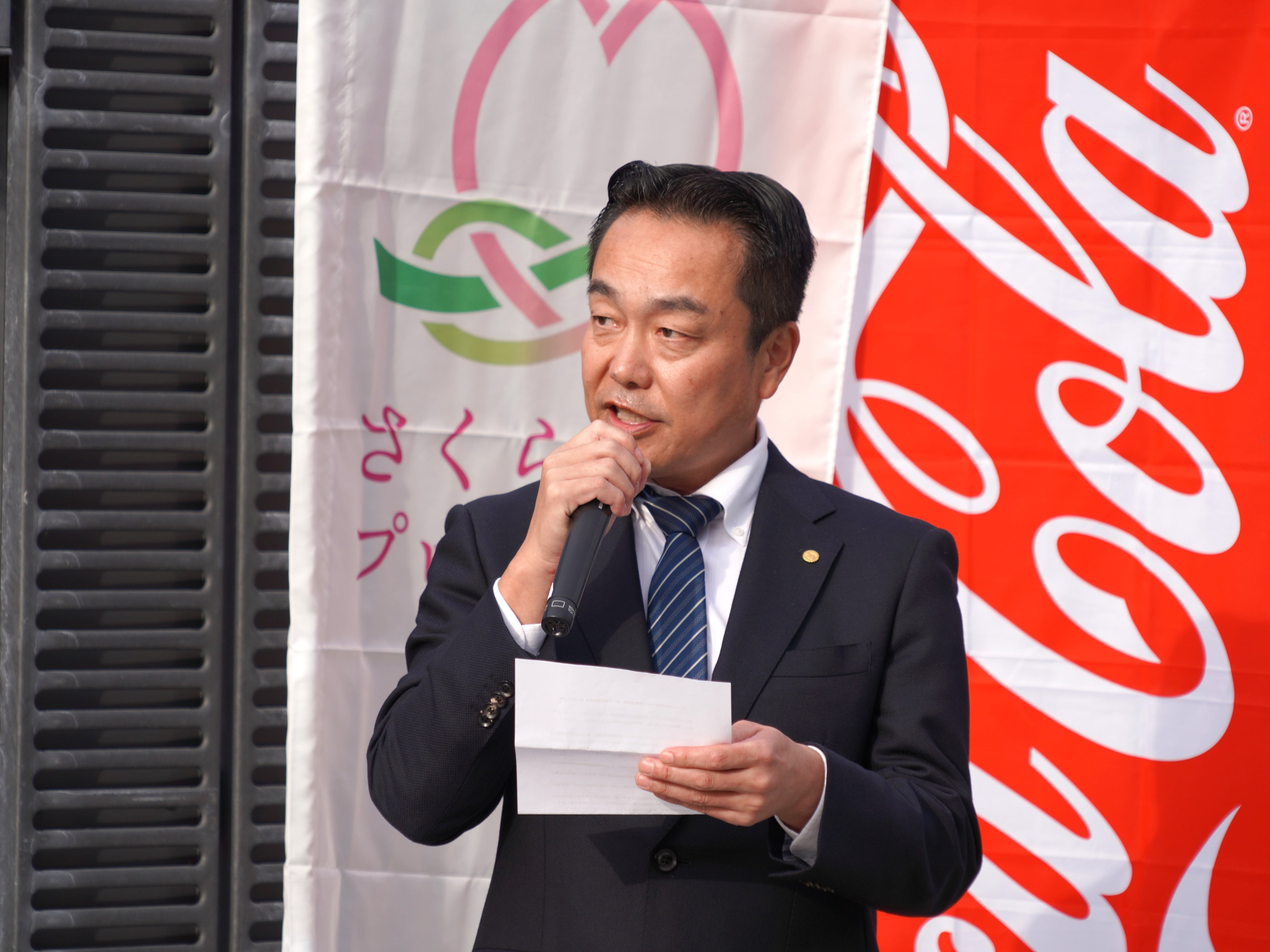 「我々は昨年から活動を開始し、春・秋と桜の木を植樹しておりますが、目標である3,000本には程遠い状況にあります。長期間にわたり資金が必要になると思われ、自動販売機の収益の一部をご寄附いただけることに感謝いたします。この自動販売機が多くの方々の目にとまることで、活動の知名度向上につながり、多くのご賛同を得られることを期待しております。陸前高田を東北有数の桜の名所にしていきたいと思っておりますので、皆さまご理解とご協力をよろしくお願いいたします。」