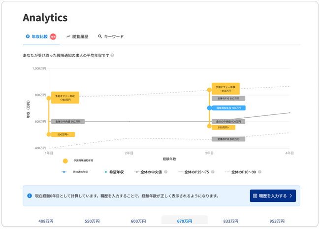 - グラフへの表示: 算出された「予測オファー年収」を、ユーザーの経験年数の位置にプロットして表示します。
