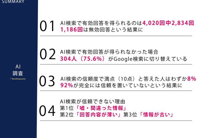 ・AI検索で有効回答が得られなかった場合、304人(75.6%)がGoogle検索に切り替えている