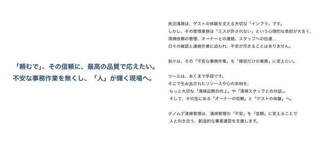 急回復するインバウンド需要の裏側で、民泊清掃の現場は疲弊。清掃漏れの不安から解放し、“人”が輝く現場を実現する「タノムデ清掃管理」がサービスサイトを公開。