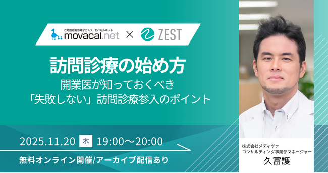 株式会社ゼスト(本社:東京都新宿区、代表取締役社長 CEO:一色淳之介)は、訪問診療の開業をテーマにした無料ウェビナーを、在宅医療対応電子カルテ「movacal.net」(以下「モバカルネット」)を提供するNTTプレシジョンメディシン株式会社(本社:東京都千代田区、代表取締役社長:是川幸士)と共催いたします。