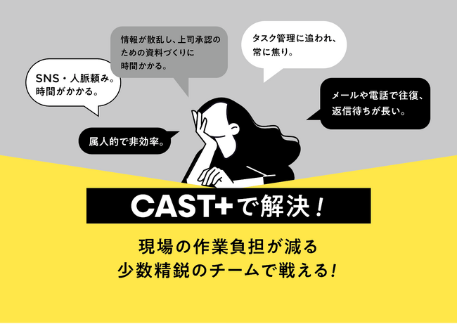 CAST+(キャスタス)とはキャストを起用する映像等のコンテンツ制作において、制作会社と芸能事務所が最適にマッチングするプラットフォームです。プロデューサー・俳優・マネージャーなど、第一線の現場の声をもとに開発し、2025年9月にリリースしました。