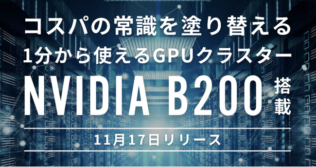GPUクラウドサービス「GPUSOROBAN」を展開する株式会社ハイレゾ(本社:東京都新宿区、代表取締役:志倉喜幸、以下当社)は、10月7日に「NVIDIA B200搭載マルチノード型ハイエンドGPUクラスタ」として発表していたサービスにつきまして、NVIDIA B200クラスター構成の環境をGPU1枚・1分単位の課金で提供し、新たにポイント制を導入した「GPUSOROBAN 計算クラスター B200」として、本日付で正式リリースしましたことをお知らせいたします。