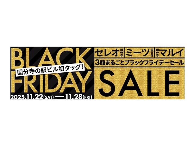 〇国分寺駅の駅ビル3館、セレオ国分寺(株式会社JR中央線コミュニティデザイン/本社:東京都小金井市/代表取締役社長:小澤 裕)、ミーツ国分寺(株式会社三越伊勢丹/本社:東京都新宿区)、国分寺マルイ(株式会社丸井 /本社:東京都中野区/代表取締役社長:青野 真博)では、2025年11月22日(土)から11月28日(金)までの7日間、初の3館合同企画となる「ブラックフライデーセール」を開催します。