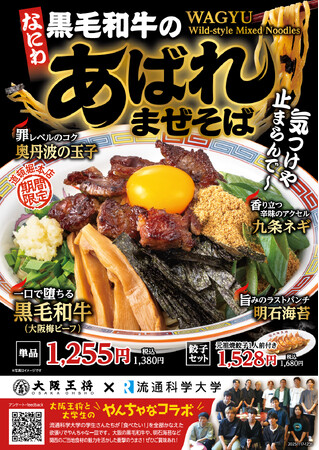 イートアンドグループで餃子専門店「大阪王将」を運営する株式会社大阪王将(東京ヘッドオフィス:東京都品川区 代表取締役社長:文野幸司)は、流通科学大学(神戸市西区/学長:清水信年)と連携をした社会共創プロジェクトとして、新メニュー『なにわ黒毛和牛のあばれまぜそば』を11月17日(月)より大阪王将 道頓堀本店にて限定販売いたします。