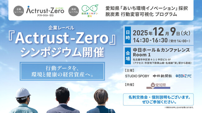 株式会社スタジオスポビー(本社:東京都渋谷区、代表取締役:夏目恭行)は、2025年12月9日(火)、中日ホール&カンファレンス(名古屋市栄)にて愛知県の「あいち環境イノベーション」採択プロダクトである行動変容アプリ「SPOBY(スポビー)」を基盤とした、「行動変容」を企業の脱炭素経営に直結させる企業レーベル『Actrust-Zero(アクトラスト・ゼロ)』シンポジウムを開催いたします。