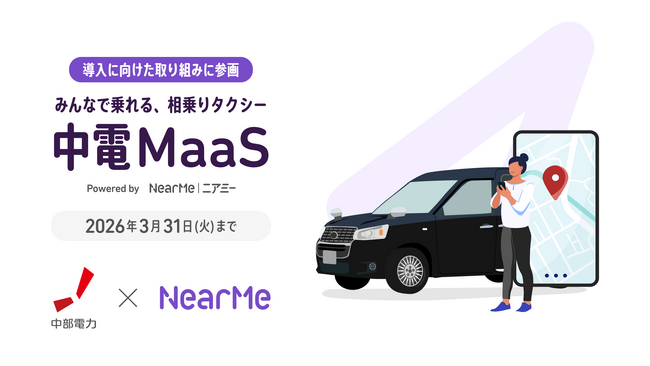 移動の課題に取り組むソーシャルデザインカンパニー、株式会社NearMe(本社:東京都中央区、代表取締役社長:高原幸一郎、以下:ニアミー)は、中部電力株式会社(本社:愛知県名古屋市東区、代表取締役社長 社長執行役員:林欣吾、以下:中部電力)と連携し、名古屋市の一部地域において実施するオンデマンド乗り合いタクシー『中電MaaS Powered by NearMe』の導入に向けた取り組みに参画します。