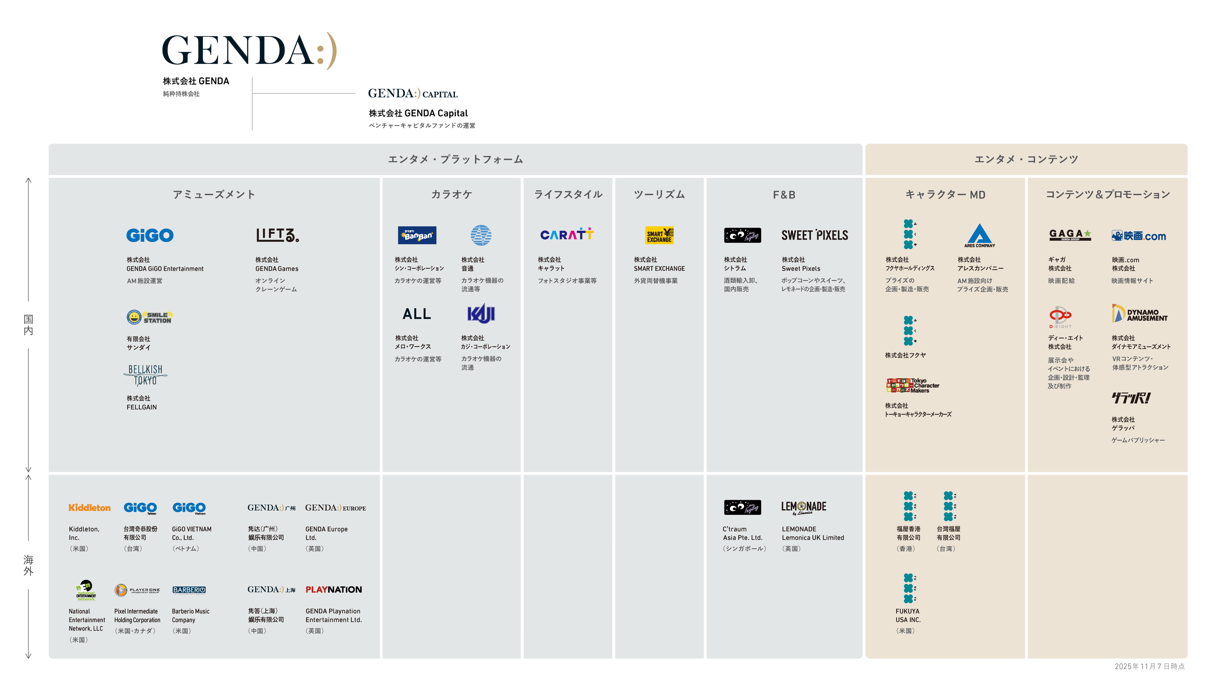 GENDAは、このAspirationの実現のため、グローバルにエンターテイメントのネットワークを構築し、世の中に流通する「楽しさの総量」を増やすことを目指すエンターテイメント企業です。