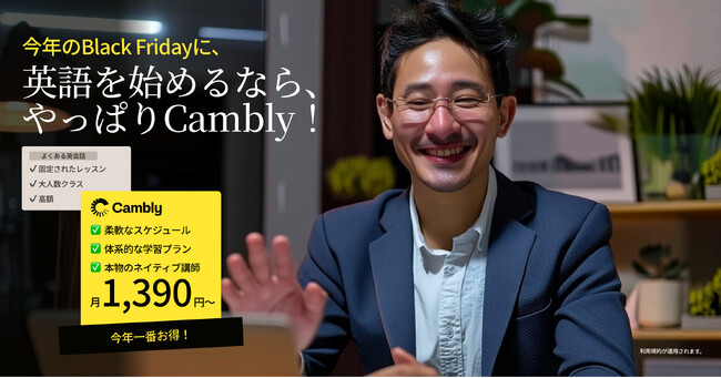 サンフランシスコ発 - Cambly Inc.(本社:米国サンフランシスコ)は、英語学習プラットフォーム「Cambly」で、Black Fridayセールを開始します。キャンペーン期間は 2025年11月18日(火)~11月28日(金) で、期間中は12ヶ月プランが50%OFF、月1,390円~の年間で最もお得な料金で利用できます。