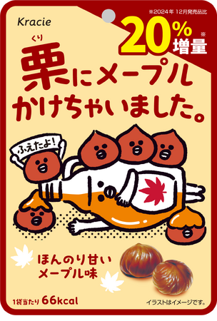 2024年に発売した「栗にメープルかけちゃいました。」は、若年層をターゲットに、スイーツのような甘さとキャラクター入りのパッケージで好評を得ました。「もっと多く食べたい」という声に応え、美味しさはそのままに20%増量して再発売いたします。1袋あたり66kcal、脂質0.5g、食物繊維2.1gで、罪悪感なく楽しめる間食としておすすめです。