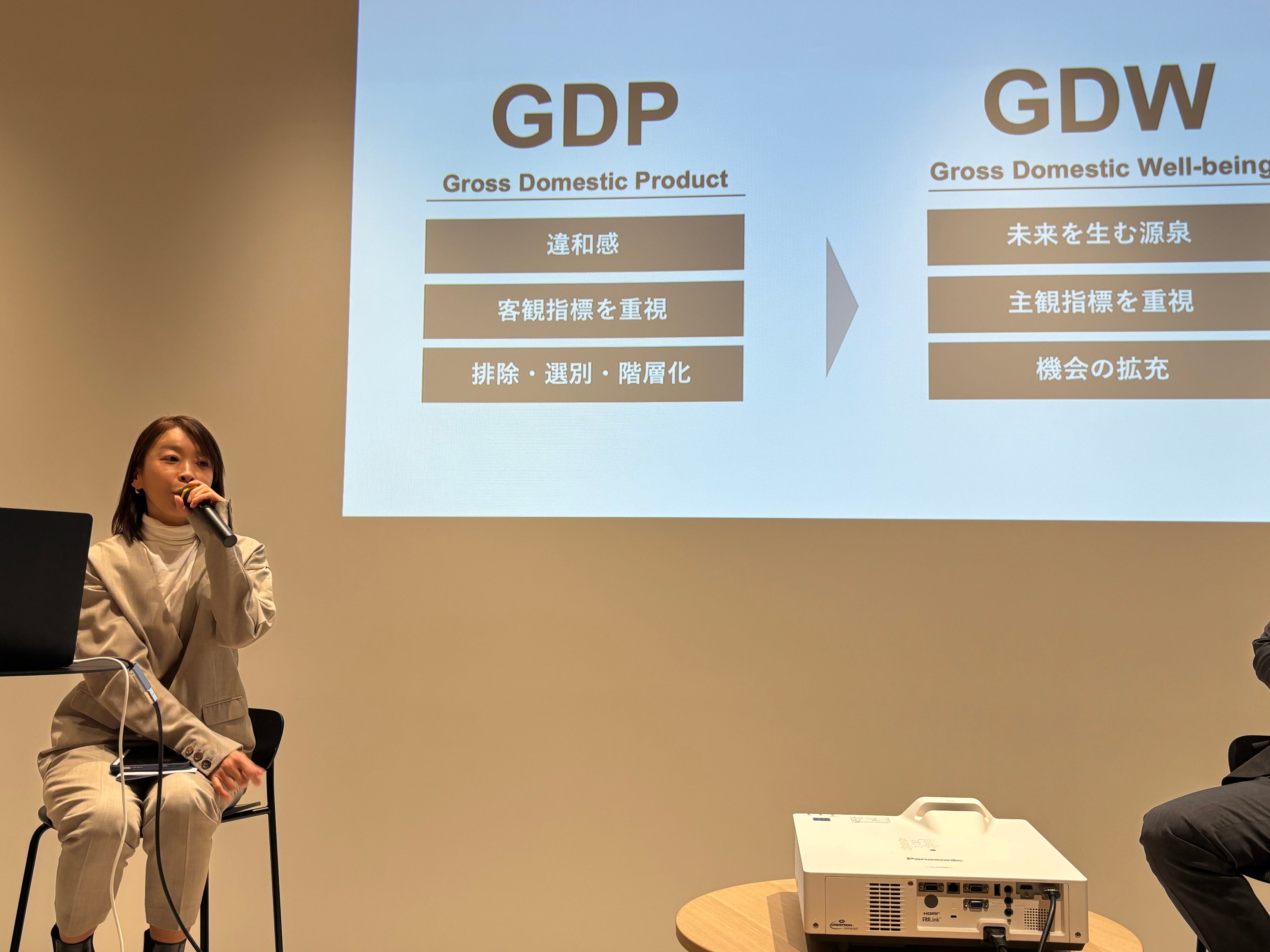 今まで、政府や法人が何を重視していたかというと完全にGDP(Gross Domestic Product)でした。GDPに縛られるがゆえに、違和感があったとしても、客観指標を重視したり、「今すぐにできる人」が選別されたり、といった状況だったのかなと思います。これからの日本は少子高齢化で、いろいろな方がそれぞれ持つ可能性を組み合わせて次の未来を生むしかないんです。そうなった時に、これからは客観指標から主観指標へ、すなわち、一人ひとりがどんな気持ちを感じているか、幸せを感じているかが大切になっていくのではないでしょうか。GDPではなく、Well-beingの総量、すなわちGDW(Gross Domestic Well-being)が経済においても重要な指標になっていくのではないかと思います。私たちのミッションは、このまま社内だけにとどまらずに、まっすぐ社会に対しても行っていきたいです。いつかはこの「女性活躍」というような目標やイベントがなくなって欲しいと心から思っています。