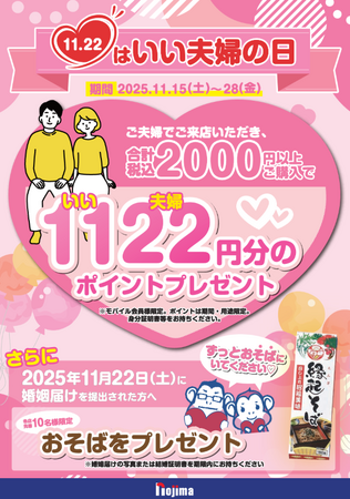 株式会社ノジマ(神奈川県横浜市、代表執行役社長・野島廣司)では、11月22日(土)の「いい夫婦の日」に合わせ、ご夫婦でご来店かつお買い物いただいたお客様に「1,122ポイント」をプレゼントするキャンペーンを実施中です!さらに11月22日に入籍されたお客様には、末永く「そば」にいられるよう「おそば」もプレゼントさせていただきます。