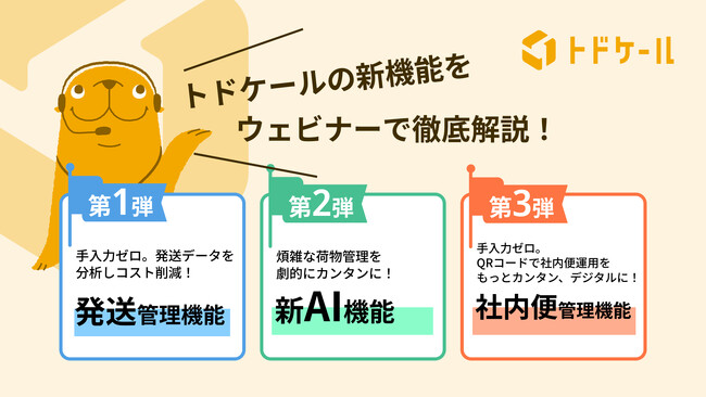 株式会社トドケール(本社:東京都千代田区、代表取締役:野島剛)は、「発送管理」「AI」「社内便」の3つの新機能を近日中に順次リリースいたします。これに伴い、新機能の具体的な活用方法や導入メリットをいち早くご紹介する無料ウェビナーを、2025年11月20日(木)より3週連続で開催いたします。
