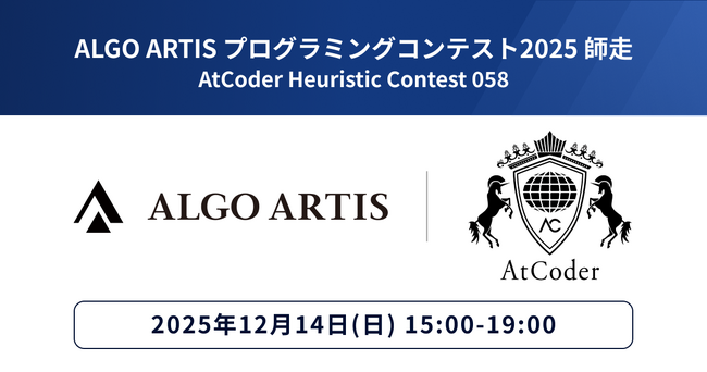 社会基盤を支えるあらゆる産業の高度な計画最適化を実現する株式会社 ALGO ARTIS(アルゴ・アーティス、本社:東京都港区、代表取締役社長:永田 健太郎、以下、ALGO ARTIS)は、2025年12月14日(日)、世界最高峰の競技プログラミングプラットフォームAtCoderにて「ALGO ARTIS プログラミングコンテスト 2025 師走 (AtCoder Heuristic Contest 058)」を開催いたします。