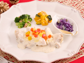 クリーミーなホワイトソースとジューシーなガーリック香るローストチキン、とろけるチーズが織りなす贅沢なチキンプレートです。ホワイトソースにトッピングしたパプリカが鮮やかさを添え、クリスマスの気分を華やかに演出します。熱々のうちにチーズをしっかり絡めてお召し上がりください。