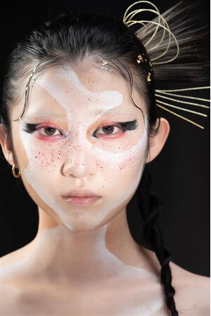 ヘアとメイク両方とてもこだわって時間をかけた作品なので凄く嬉しいですし、今までの知識や技術を活かして制作することができ、良い経験になりました。1番こだわったのは顔から首下まで伸びる白の陰影です。立体感を出すために数種類の筆やスポンジなどを使い、綺麗なグラデーションを作り上げました。麻生美容専門学校では、通常の授業以外にも選択授業が豊富で外部からの講師の先生から技術を教えてもらうことができます。また、ヘアショーなど実際に現場のお仕事を多く経験できる点も自身の成長に繋がっていると思います。将来は、美容師とヘアメイクアップアーティストの両方を武器にする技術者になって有名になりたいので、今回の経験を糧に頑張っていきます!